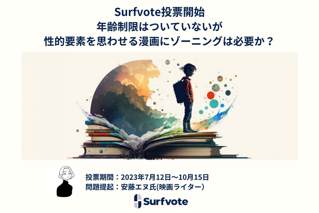 SNSとテクノロジーで社会課題の発見・解決をサポートするICTスタートアップのPolimill株式会社(ポリミル、本社:東京都港区、代表取締役:横田えり、以下Polimill社)は2023年7月12日、新イシュー「年齢制限はついていないが性的要素を思わせる漫画にゾーニングは必要か?」についてSurfvoteで意見投票を開始しました。https://surfvote.com/issues/uvev90x0y71d