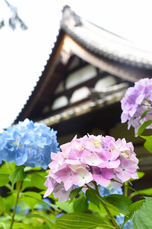 「あじさい寺」として市民らに親しまれている「賴光寺」(らいこうじ、東畦野2)、「西洋アジサイ」や「おたふく」などのアジサイの品種約500株がそろそろ見頃を迎える。青やピンクに色づいた美しいアジサイを一目見ようと、カメラを持った人たちが境内を訪れ、散策を楽しんでいた(参拝料無料)。