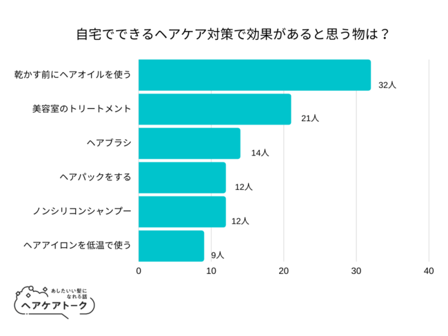 「自宅でできるヘアケア対策で効果があると思う物は?」とアンケート調査した結果、1位は『乾かす前にヘアオイルを使う』でした。