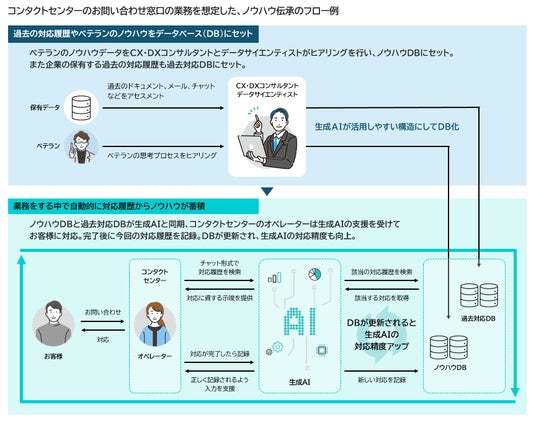 本サービスは、コンタクトセンターに蓄積するベテランの属人ノウハウや過去の対応履歴をデータベース化し、新人担当者等の業務における問題発生の際に、生成AIがベテランに代わって原因の特定や、解決の示唆を行う一連の業務フロー・システムです。アセスメントや試験運用から業務実装まで、各企業のニーズに合わせたサービス提供が可能です。