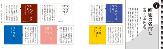 それぞれの「色」や「色の名前」の由来や物語をたっぷりと楽しむことができるほか、色見本では色イメージを感じたり、繊細な色みの差異を数値で確認できるようになっています。