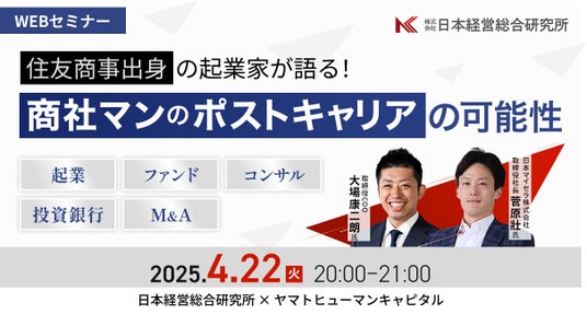 ヤマトヒューマンキャピタル株式会社(本社:東京都千代田区、代表取締役:堀江 大介)は、2025年4月22日(火) 20:00よりオンラインにて、株式会社日本経営総合研究所 取締役COO 大場康二朗氏、日本マイセラ株式会社 取締役社長 菅原壯氏にご登壇いただくウェビナー『住友商事出身の起業家が語る! 商社マンのポストキャリアの可能性!』を開催いたします。