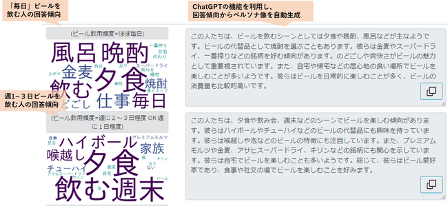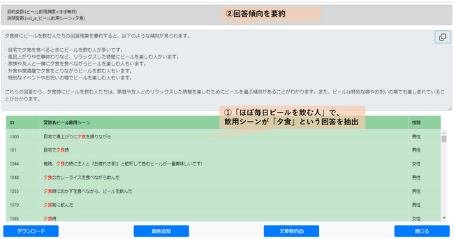 “知りたい人”を特徴づける項目(選択肢と自由回答)の「特徴ランキング」の結果をワンクリックで文章として要約することが可能になります。