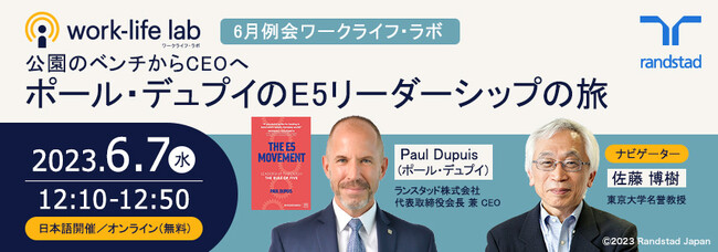 総合人材サービスを提供するランスタッド株式会社(本社:東京都千代田区 代表取締役会長兼CEO ポール・デュプイ)は、6月7日(水)に無料ウェビナー「公園のベンチからCEOへ ポール・デュプイのE5リーダーシップの旅」を開催いたします。新時代のワークライフを研究する「ワークライフ・ラボ」の第10回として開催するもので、東京大学名誉教授の佐藤博樹氏がナビゲーターを務めながら、弊社代表取締役会長 兼 CEOであるポール・デュプイが出身地であるカナダの片田舎から、ポケットに全財産の約3万円とバックパックひとつで初来日した大阪・西成の公園のベンチで一夜を過ごした後、現在グローバル企業の日本代表に昇り詰めるまでのリーダーシップの旅について語ります。