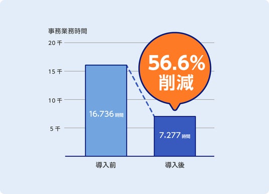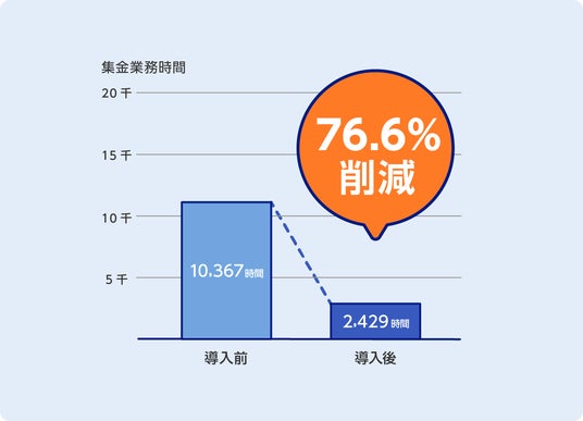 佐賀県内の自治体に協力いただき当社が調査した結果では、集金業務では76.6%、事務業務全体でも56.6%という大幅な業務削減効果が見られました。