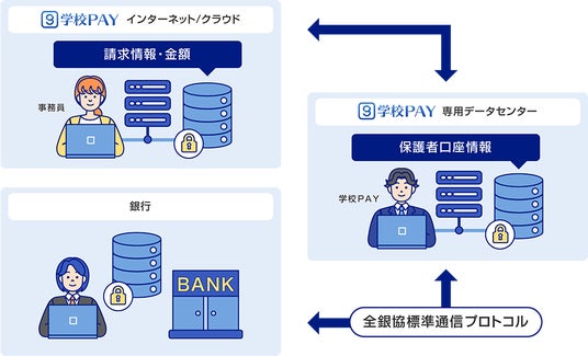 「学校PAY(R)」は保護者の口座情報をクラウド上に保管しません。口座情報は銀行との専用通信で送信するため、インターネット経由で情報が漏洩する心配がありません。