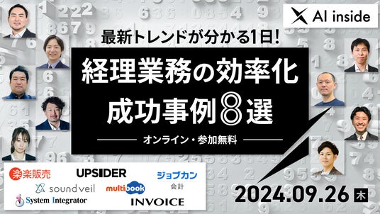 株式会社システムインテグレータ(本社:さいたま市中央区、代表取締役社長:引屋敷 智、東証スタンダード:証券コード3826)は、AI inside 株式会社(東京都渋谷区、代表取締役社長CEO:渡久地択)が2024年9月26日(木)に開催する「最新トレンドが分かる1日!経理業務の効率化成功事例8選」と題した無料ウェビナーに登壇することをお知らせします。