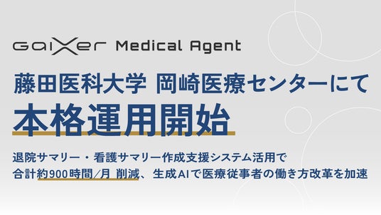株式会社FIXER(本社:東京都港区、代表取締役社長:松岡 清一、以下FIXER)は、藤田医科大学 岡崎医療センター(愛知県岡崎市、以下 岡崎医療センター)において、医療業務支援に特化した生成AIサービス「GaiXer Medical Agent(ガイザー・メディカル・エージェント)」の本格運用を開始したことをお知らせします。
