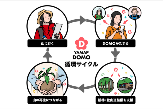 概要:「YAMAP DOMO」は「いいね」の進化系です。コミュニケーションや承認欲求的な役割が強かった「いいね」から、他者やコミュニティに貢献する機能へバージョンアップすることをDOMOの目的としています。共感・感謝・応援の気持ちをユーザー同士でおくり合い、たまったDOMOポイントは山の再生支援プロジェクトに活用できます。