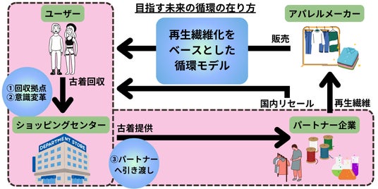 衣料品廃棄物の削減に向けて、ショッピングセンターを拠点とした、サーキュラーエコノミー型社会モデル構築。商業施設の強みである地域や顧客、事業者との繋がり活かし、アパレルの循環型社会を目指すための「プラットフォーマー」の役割を担い、将来的に再生繊維の需要の拡大を見据え、衣料品を回収し、パートナーへ引き渡す仕組みを構築することで、環境負荷の低減とサプライチェーンへの貢献を目指しています。