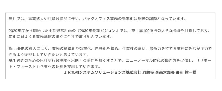 JR九州システムソリューションズ株式会社はSmartHRの導入により、従業員数の急増に伴う手続きの増加にも効率的に対応でき、また法改正時においても迅速に手続きを適合できます。SmartHRは、JR九州システムソリューションズ株式会社が従来行っていた紙や表計算ソフト中心の非効率な作業の改善や行政機関へ出向く時間の削減、テレワーク推進といった“ニューノーマル時代の働き方”を全社的に進行するための時間抽出の一助となります。