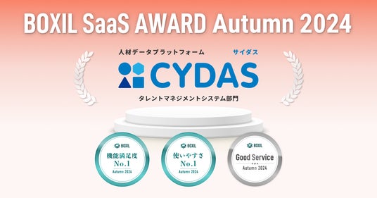 株式会社サイダス(本社:東京都港区、代表取締役:松田 晋、以下 サイダス)が提供する人材データプラットフォーム「CYDAS(サイダス)」が、スマートキャンプ株式会社(以下、「スマートキャンプ」)が主催する「BOXIL SaaS AWARD Autumn 2024」のタレントマネジメントシステム部門で「Good Service」のほか「使いやすさNo.1」「機能満足度No.1」に選出されました。