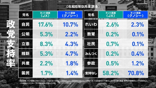 JX通信社がネット調査主体の移行期に実施した調査からは、政党支持や次期衆院選比例投票先について「分からない」(態度未定)の層が従来よりも減る傾向が確認されました。