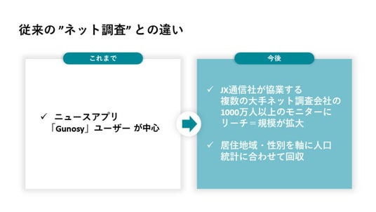 これまでのネット調査の対象は、ニュースアプリ「Gunosy」ユーザーを中心としていました。今月以降は、JX通信社の協業する複数の大手ネット調査会社のモニター(1000万人以上)から回答を集めることが可能になり、調査対象の規模が拡大いたします。