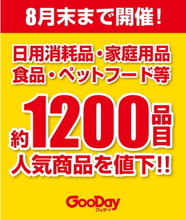 グッデイプライス対象商品は、全グッデイ店舗でも売上数上位及び人気の品目約1,200を通常価格より平均5~10%前後値下げ価格に設定、店頭にて「お買い得SALE」「毎日お買得」のPOPを掲示します。