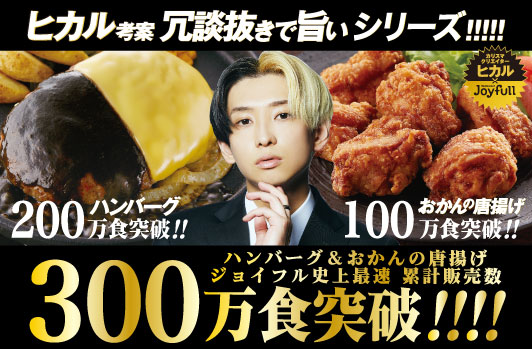 ファミリーレストランのジョイフル((株)ジョイフル 本社:大分県大分市 代表取締役社長:穴見くるみ)は、全国のジョイフル店舗やオンラインショップにて好評販売中のヒカルさんとのコラボレーション商品『ヒカル考案 冗談抜きで旨いハンバーグ』『ヒカル考案 冗談抜きで旨いおかんの唐揚げ』のシリーズ累計販売数が300万食を突破したことをお知らせします。