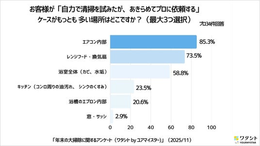 もっとも多かったのは「エアコン内部」で、85.3%のプロが「途中で諦めて依頼されるケースが多い」と回答しました。続いて「レンジフード・換気扇」(73.5%)、「浴室全体(カビ・水垢)」(58.8%)と、汚れが蓄積しやすく構造が複雑な場所が上位を占める結果となりました。