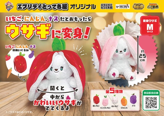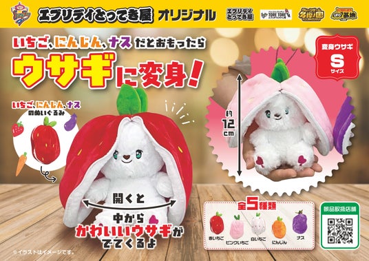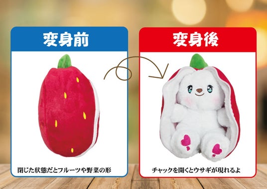 「変身うさぎ」は、イチゴや人参などの野菜やフルーツを模したユニークな見た目のぬいぐるみ。しかし、チャックを開けると……中からウサギが登場!見た目のギャップが楽しい“1つで2度楽しめる”仕様となっており、思わず何種類も集めたくなるラインナップです。