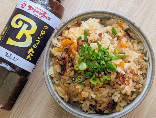 アレンジ例)『ブロンコのたれ』を使った炊き込みごはん 例えば、『ブロンコのたれ』を使った炊き込みごはん。小さめにカットしたお好きなお肉と、ごぼうや人参などの野菜を炊飯器に入れ、『ブロンコのたれ』で味を整え炊飯。炊き上がったところに、さらにソースをひとかけし混ぜ合わせると、おこげの香ばしさとたれのフレッシュな味わいが引き立ち、食欲を刺激します。