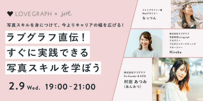 ミレニアル世代向けコミュニティブランドを運営するSHE株式会社(所在地:東京都港区、代表取締役CEO:福田恵里、以下SHE)は、出張撮影サービスを運営する株式会社ラブグラフ(本社:東京都渋谷区、代表取締役社長:駒下純兵、以下ラブグラフ)と提携し、未経験からフォトグラファーを目指す方のキャリア支援を開始します。