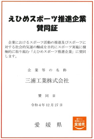 産業用ボイラのトップメーカーである三浦工業株式会社(本社:愛媛県松山市、代表取締役:宮内大介)は、2022年12月27日、「えひめスポーツ推進企業」に賛同し、愛媛県より賛同証が交付されました。