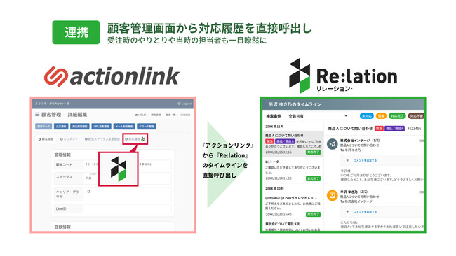 『アクションリンク』内の顧客管理画面上のボタンをクリックすることで、その顧客とのこれまでのやり取りを『Re:lation』のタイムライン機能(顧客との対応履歴)を使ってワンクリックで呼び出すことができるようになりました。