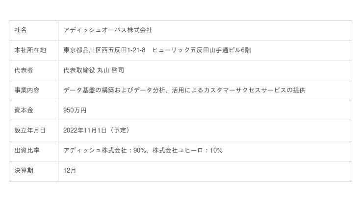 デジタルエコノミー特化のカスタマーサクセスソリューション・プロバイダーであるアディッシュ株式会社(本社:東京都品川区、代表取締役 江戸 浩樹、証券コード:7093、以下 アディッシュ)は、企業組織運営およびデジタルマーケティング戦略のコンサルティング、デジタル基盤構築、保守、運用の株式会社ユヒーロ(本社:東京都千代田区、代表取締役 上村 孝寛、以下 ユヒーロ)と、2022年10月14日に合弁会社「アディッシュオーパス株式会社」(本社:東京都品川区、以下 アディッシュオーパス)設立の決議をしたことを発表します。