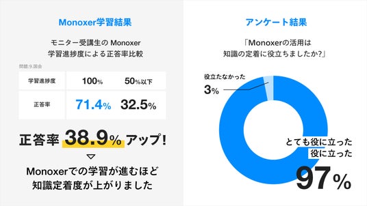 さらに、受講生を対象としたアンケート調査では、Monoxerを使用した場面として「移動時間中」、「大学やLEC講義開始前」、「就寝前の時間」が挙げられました。また、「スキマ時間を活用した学習時間が増えたか」という問いには87%が「増えた」、13%が「すごく増えた」と回答し、「Monoxerの学習が役に立ったか」については97%が「とても役に立った・役に立った」と回答しました。