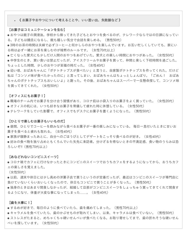 のちほど、自由回答で教えてもらったお菓子に関するエピソードや考えを紹介しますが、健康に関するものだと「体重が気になる」「食べすぎて太った」という声のほかに、「歯が悪くなって以前のように固いお菓子を食べられなくなった」「虫歯になって甘いお菓子を控えるようになった」など、歯に関する話も多く寄せられました。