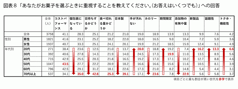 ほかにも「個包装になっている」「カロリー」「添加物の有無や量」の項目は、若いほど重視する割合が低く、年齢が上がるほど高くなっています。