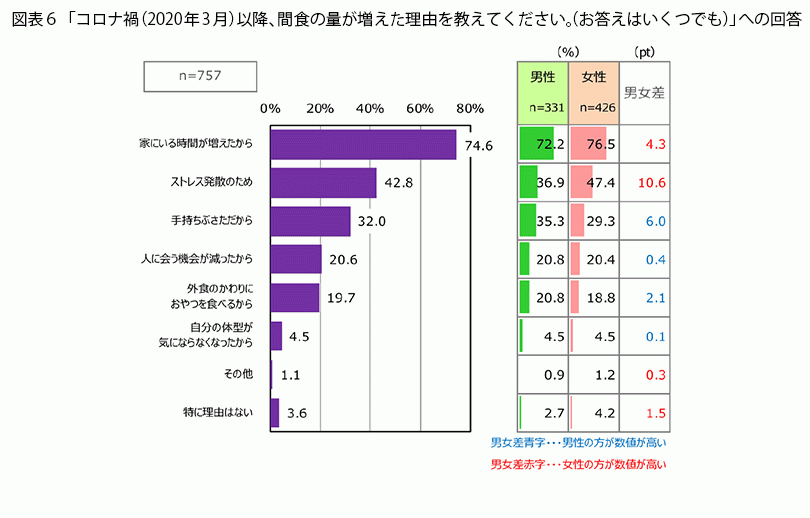 間食が増えた人に対して、その理由を聞いたところ(図表6)、最も多かったのが「家にいる時間が増えたから」(74.6%)でした。「ストレス発散のため」と回答した人も42.8%と、半数近くになります。また、「ストレス発散のため」と回答した男女は10ポイント以上の差がついています。