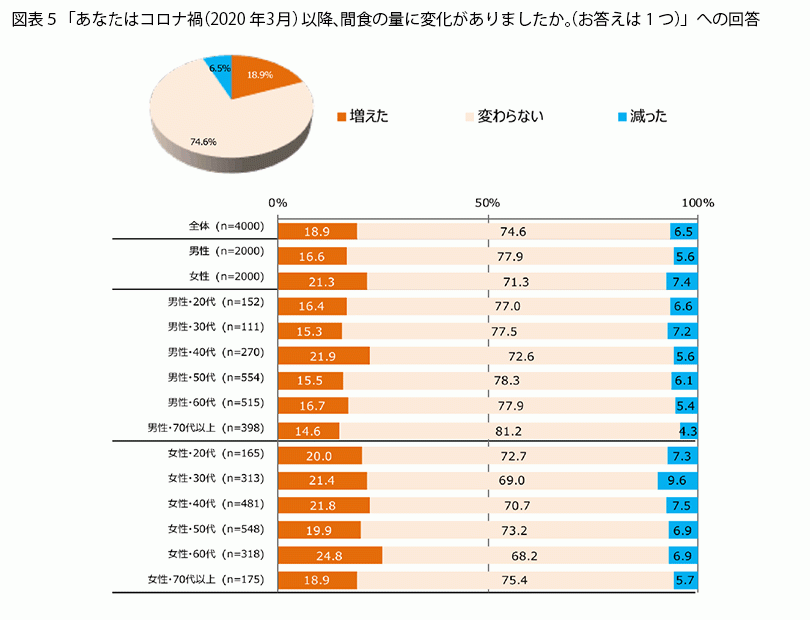 コロナ禍以降、間食の量に変化があったかを聞いてみると(図表5)、74.6%の人が「変わらない」と回答しました。ただ、「減った」(6.5%)と比べると、「増えた」という人は18.9%と、高い割合になっています。また、テレワークをしている人の場合、「増えた」と答えたのは34.1%で、全体よりもかなり高くなっています。(テレワークをしていない人で「増えた」は16.5%。図表不掲載。)