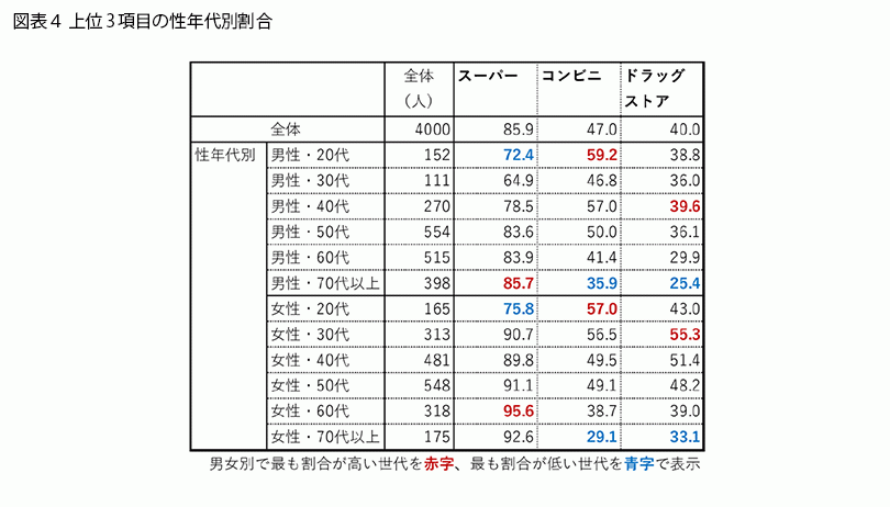上位3項目について性年代別に見ると(図表4)、「スーパー」は若いほど選んだ割合が低く、逆にコンビニは若いほど選んだ割合が高くなっています。