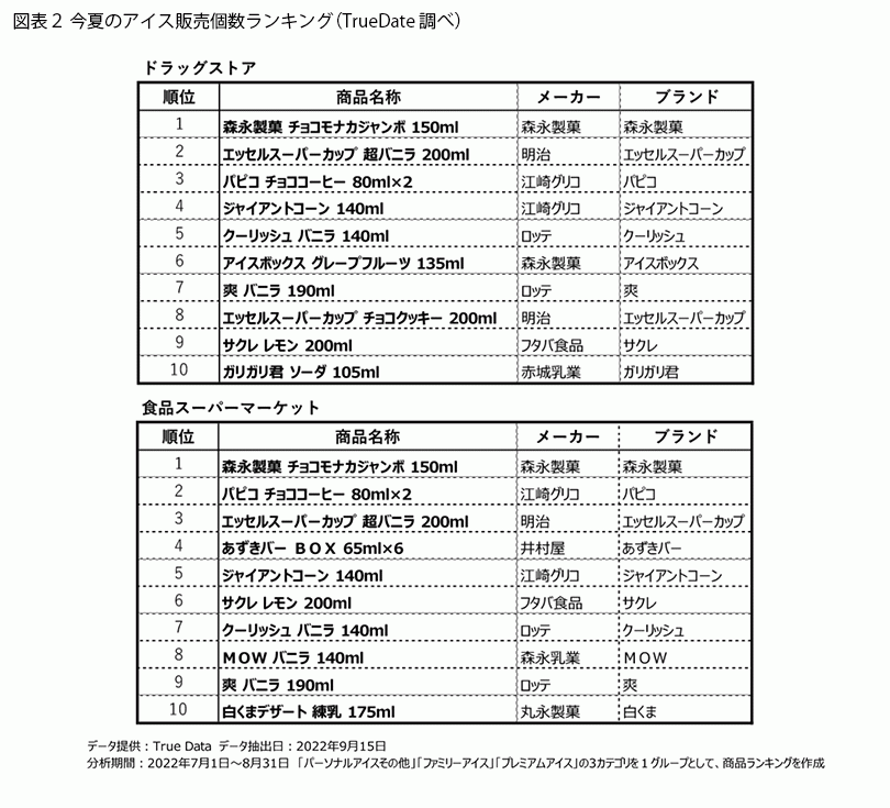 今回の調査は8月末から9月頭に行いました。夏真っ盛りに一番売れたアイスは何でしょうか。ドラッグストアと食品スーパーマーケットでの販売個数ランキング(図表2)を見ると、どちらでも1位に輝いたのが「森永製菓 チョコモナカジャンボ 150ml」です。どちらのランキングでも登場商品の顔ぶれは似通っていますが、ドラッグストアではランキング圏外ながら、食品スーパーマーケットでは「あずきバー」が4位、「白くまデザート 練乳」が10位に食い込んでいます。逆にドラッグストア10位の「ガリガリ君 ソーダ」は食品スーパーマーケットでは圏外。お店の形態によって手に取るアイスにも違いが出るようです。