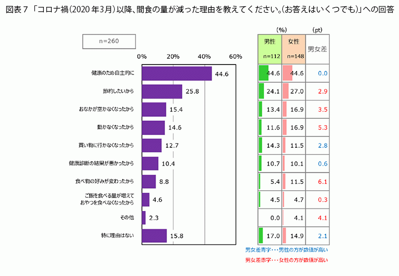 逆に、コロナ禍以降、間食の量が減った人にその理由を聞いたところ(図表7)、最も多かったのは「健康のため自主的に」(44.6%)という答えでした。「健康診断の結果が悪かったから」(10.4%)という人と比べると、ずいぶん高い割合です。