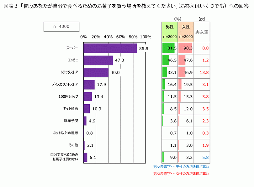 次に、自分で食べるためのお菓子をどこで買うかを聞きました(図表3)。