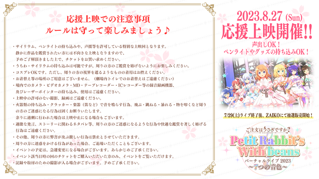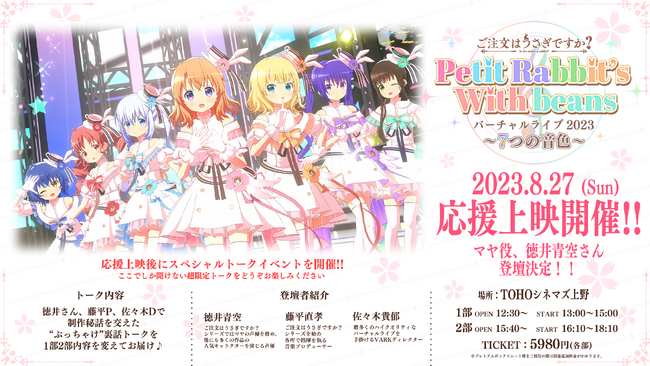 本イベントは、7月29日(土)にZAIKOにて配信された『ご注文はうさぎですか?Petit Rabbit's with beans バーチャルライブ2023 ~7つの音色~』の劇場応援上映で、TOHOシネマズ上野にて2023年8月27日(日)に開催いたします。