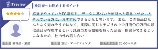 レビューでは、「商品開発か」「販売商品の選定」「販売施策」などさまざまなシーンの中で合理的な判断をするにあたり欠かせないツールとしてご活用いただいているとのお声を多数いただいています。