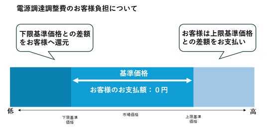 市場価格が電源調達調整費の基準価格範囲を超える場合は上限基準価格との差額をお客様にご負担いただきますが、下回る場合には下限基準価格との差額をお客様へ還元いたします。なお、市場価格が基準価格範囲内で推移している場合、電源調達調整費は0円となります。
