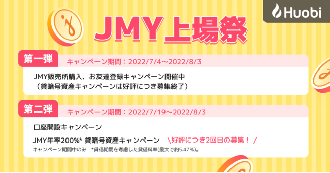 フォビジャパン株式会社(所在地:東京都港区、代表取締役社長:関 磊、以下「フォビジャパン」)は、【新規上場記念】JMY上場祭の第二弾!「口座開設・JMY年率200%*貸暗号資産キャンペーン」を7/19(火)より実施いたします。