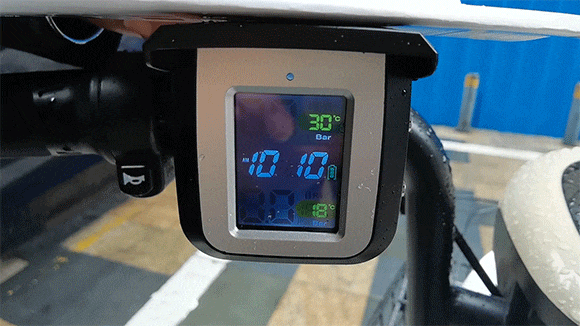 モニターに表示されている数値を確認するだけでタイヤの状態が分かる空気圧計「Tire Go」。