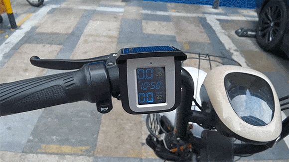 モニター上部にソーラーパネルが搭載。太陽光で充電しているので電気の節約も可能です。晴れの日には、走行しながら充電できます。