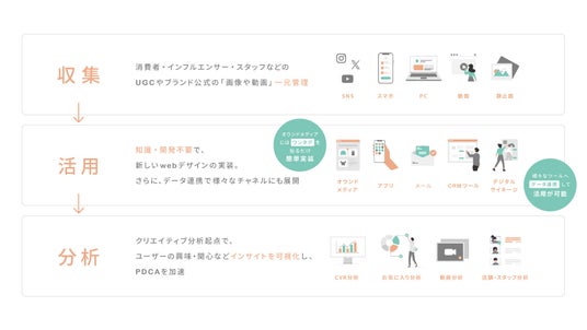 SNS上のUGC、スタッフ投稿、動画、レビューなど多様なクリエイティブ資産を収集・一元管理し、ECサイトやブランドサイトにノーコードで簡単に活用できます。