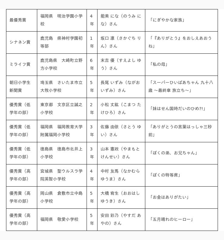 そのような日常の中から、身近な家族に対する感謝を発見し、その気持ちをまっすぐに伝える数々の作品の中から、上位4作品、優秀賞6作品、団体賞5団体を選出いたしました。