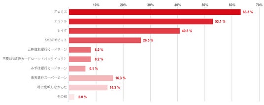 アコムと同じ大手の消費者金融を比較対象としている人が多かった。アコムで即日の借入を検討している人が、他の消費者金融の審査スピードや手続きの利便性などを比べていると考えられる。