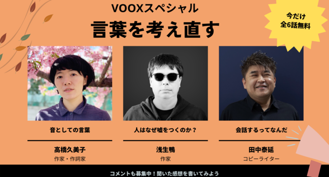 誰もが日々触れる「言葉」に、新たな視点が加わるようVOOX厳選3作品を、2022年12月25日(日)まで、限定無料公開。コミュニケーションをより良くしたい、伝わる文章を書きたい方におすすめ。