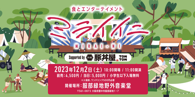 ワンズトライン株式会社(本社:大阪市北区芝田2丁目3番16号、代表取締役:山内仁)が運営する「元祖豚丼屋TONTON」は、12月2日(土)大阪・服部緑地野外音楽堂で開催される「ミライイニ」へのご招待キャンペーンをおこないます。