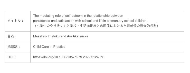 幼児期・児童期におけるやり抜く力、粘り強さは、将来の教育のアウトカム(学習に対する態度、学業成績、生活満足度など)を予測する重要な要因であるといわれています。本研究は、小学生のやり抜く力(粘り強さ)、自尊感情、学校・生活満足度の関連性を実証しました。今後も教育に貢献する研究成果を発表できるように努めたいと思います。