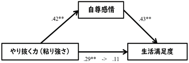 3)粘り強さの高さと生活満足度の高さの関係は、自尊感情の高さに媒介される(図2)