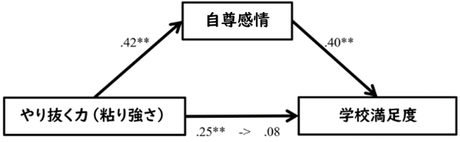 2)粘り強さの高さと学校満足度の高さの関係は、自尊感情の高さに媒介される(図1)